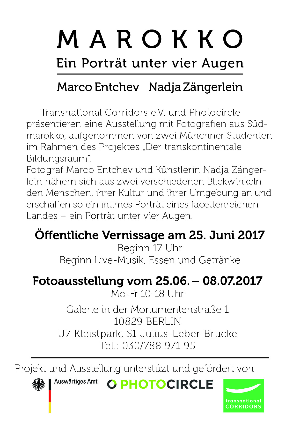 In Berlin eröffnete Transnational Corridors am 25. Juni 2017 eine Fotoausstellung mit Werken von Marco Entchev und Nadja Zängerlein. Nadja Zängerlein und Marco Entchev, zwei junge Münchner Fotografen, erhielten im Rahmen unseres Projekts „Der Transkontinentale Bildungsraum“ Stipendien, um Südmarokko künstlerisch zu erkunden. Zwischen dem 25. Juni und dem 08. Juli 2017 zeigten sie in der Galerie von Photocircle wie sie ihre Begegnungen in Südmarokko fotografisch verarbeiteten. Während Marco Entchev den Menschen sehr nach kommt und ihre Gefühlswelt offenbart, arbeitet Nadja Zängerlein abstrakter mit Formen und Farben, die sie in Serien kombiniert. Es sind zwei verschiedene Arten das Neue zu erschließen. Nadja Zängerlein studierte Kunstpädagogik in München und Marco Entchev fotografiert unter anderem für die Berliner Agentur Photocircle, wo seine Bilder erworben werden können.